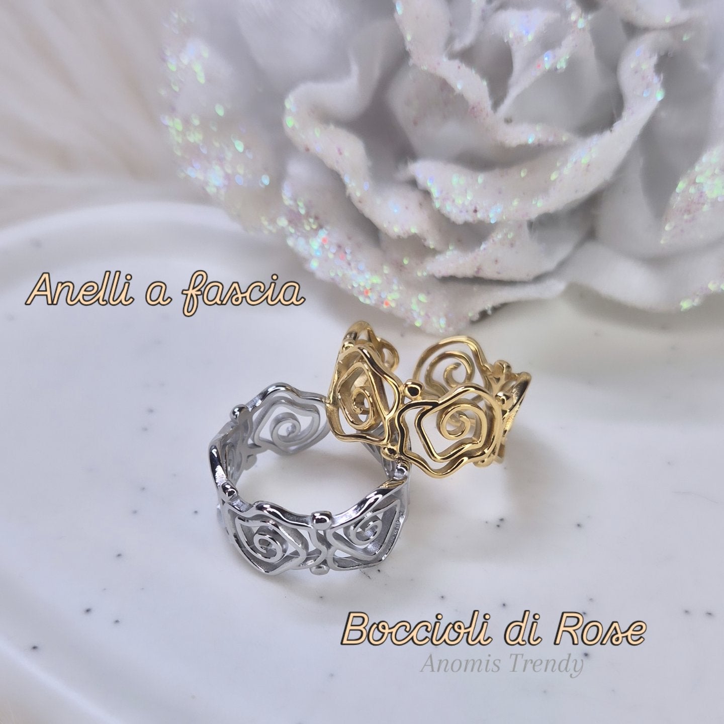 Anello a Fascia Boccioli di Rose acciaio mis.regolabile silver o gold