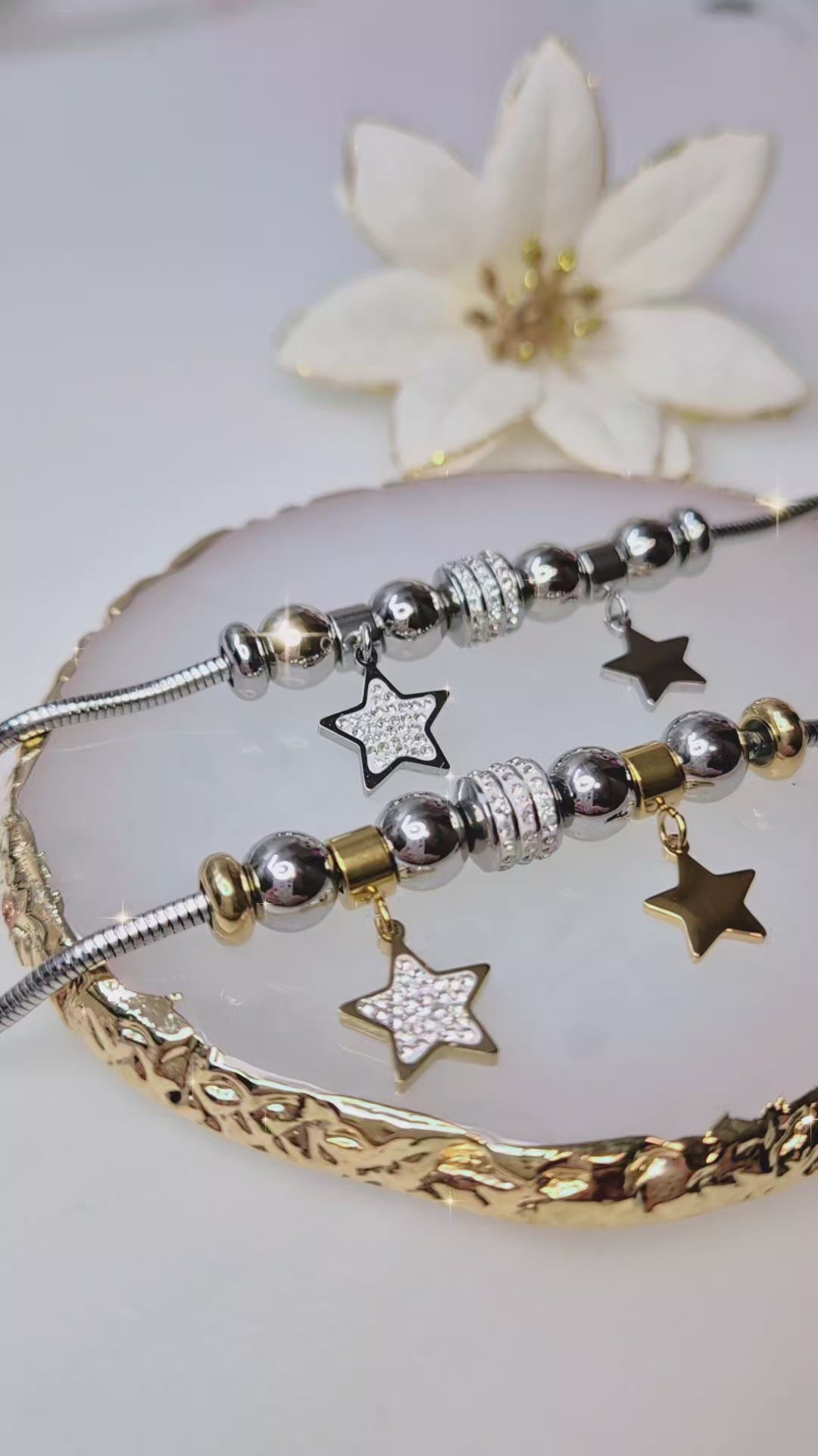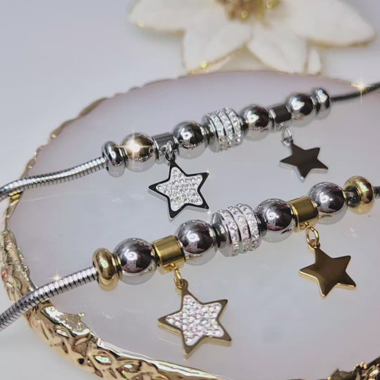 Bracciale catena tubolare snake in Acciaio Silver con charms Stelle silver/gold e zirconi crystal mis.regolab.