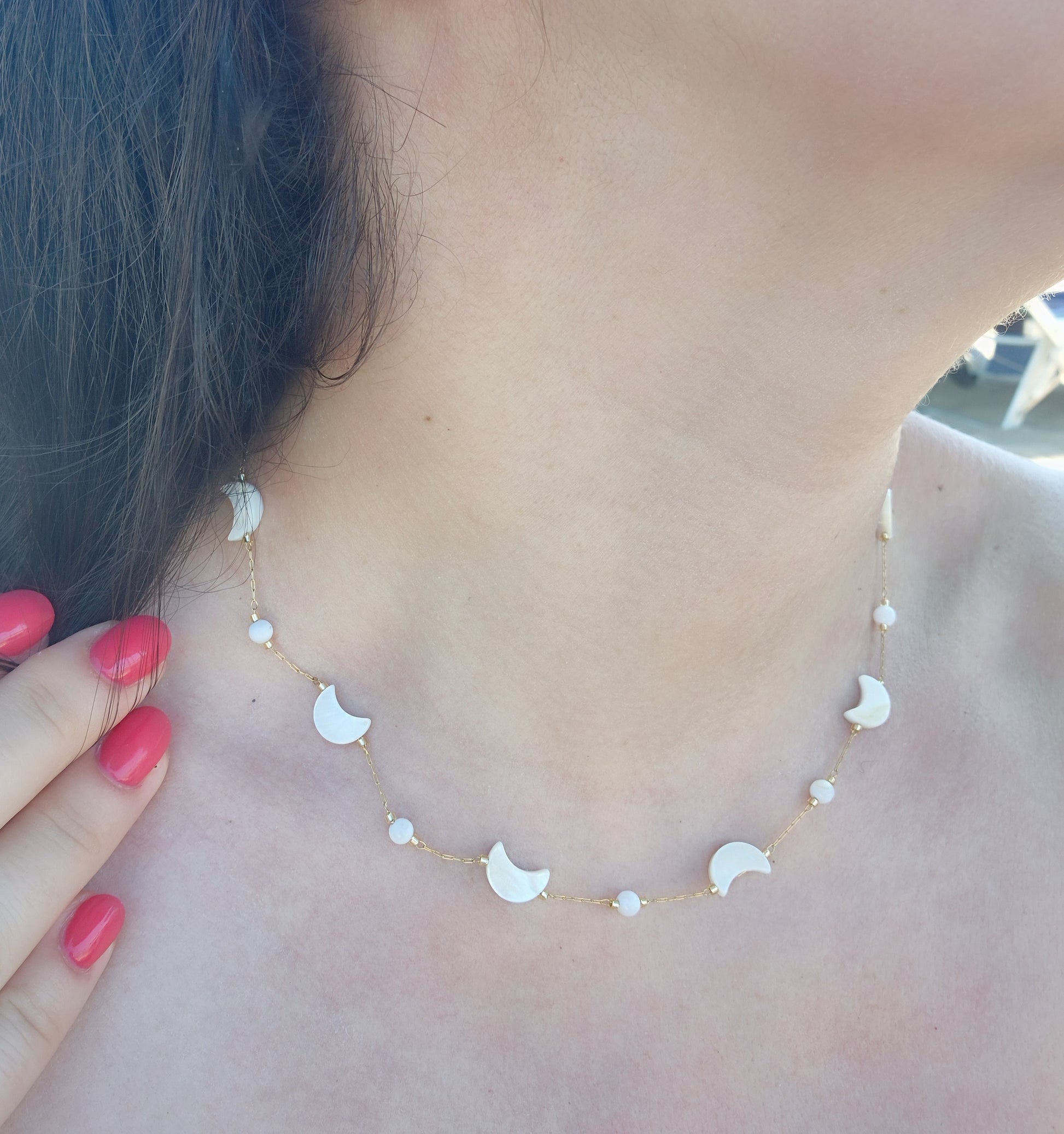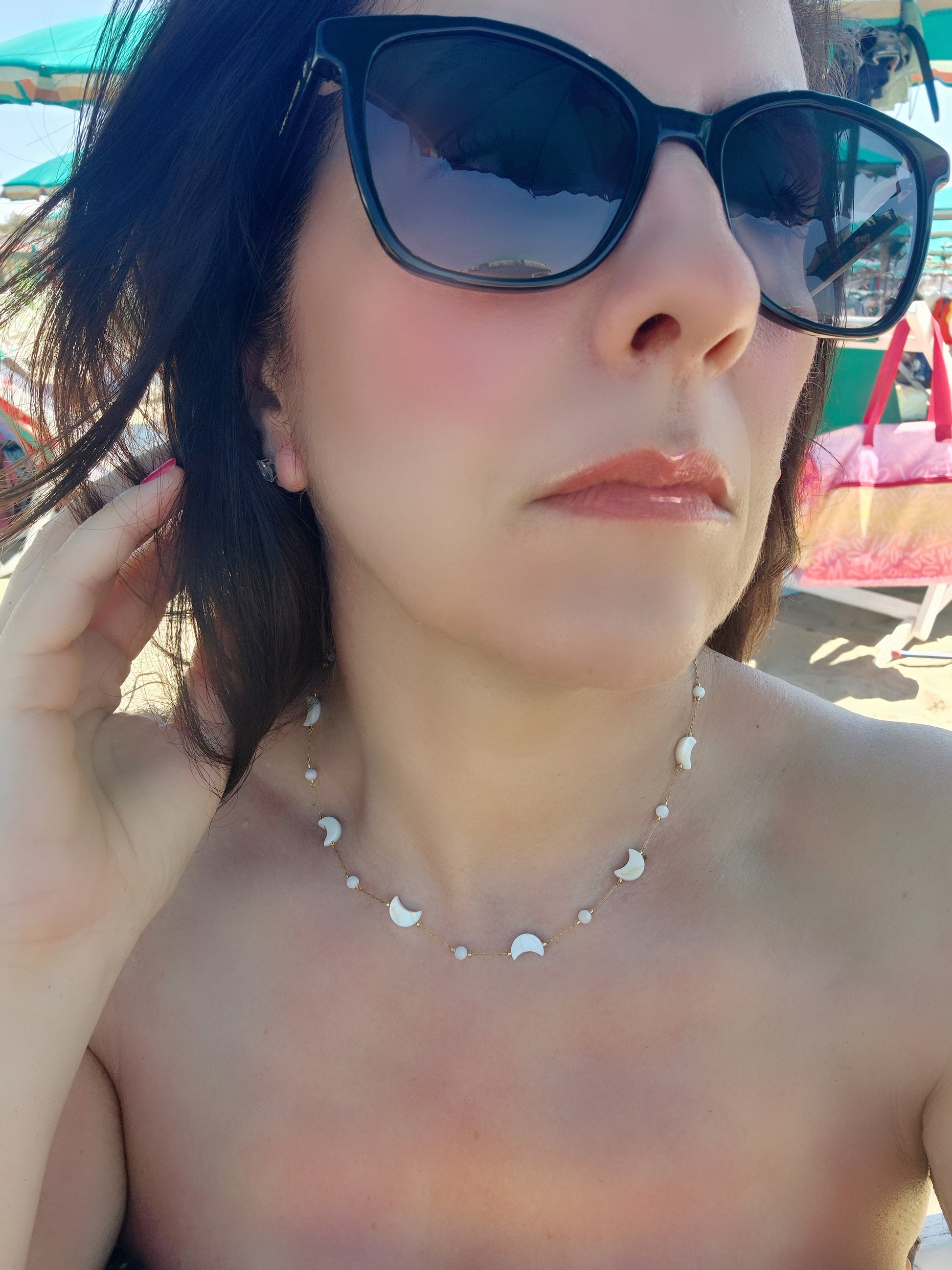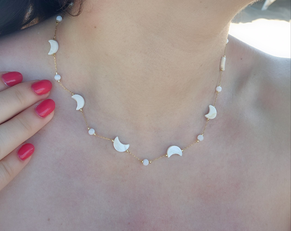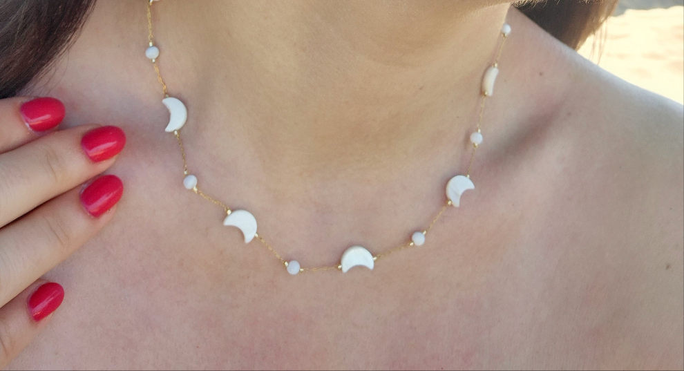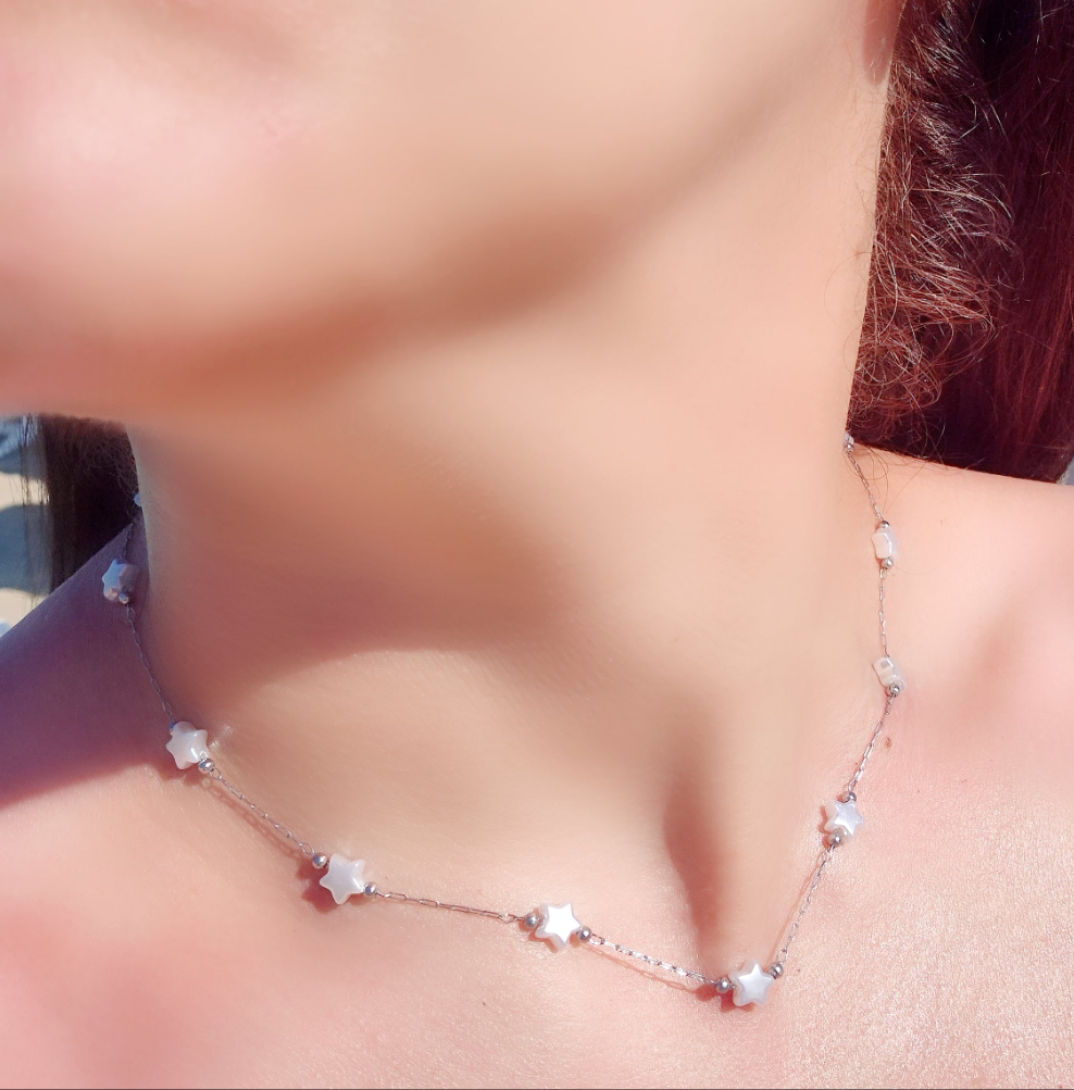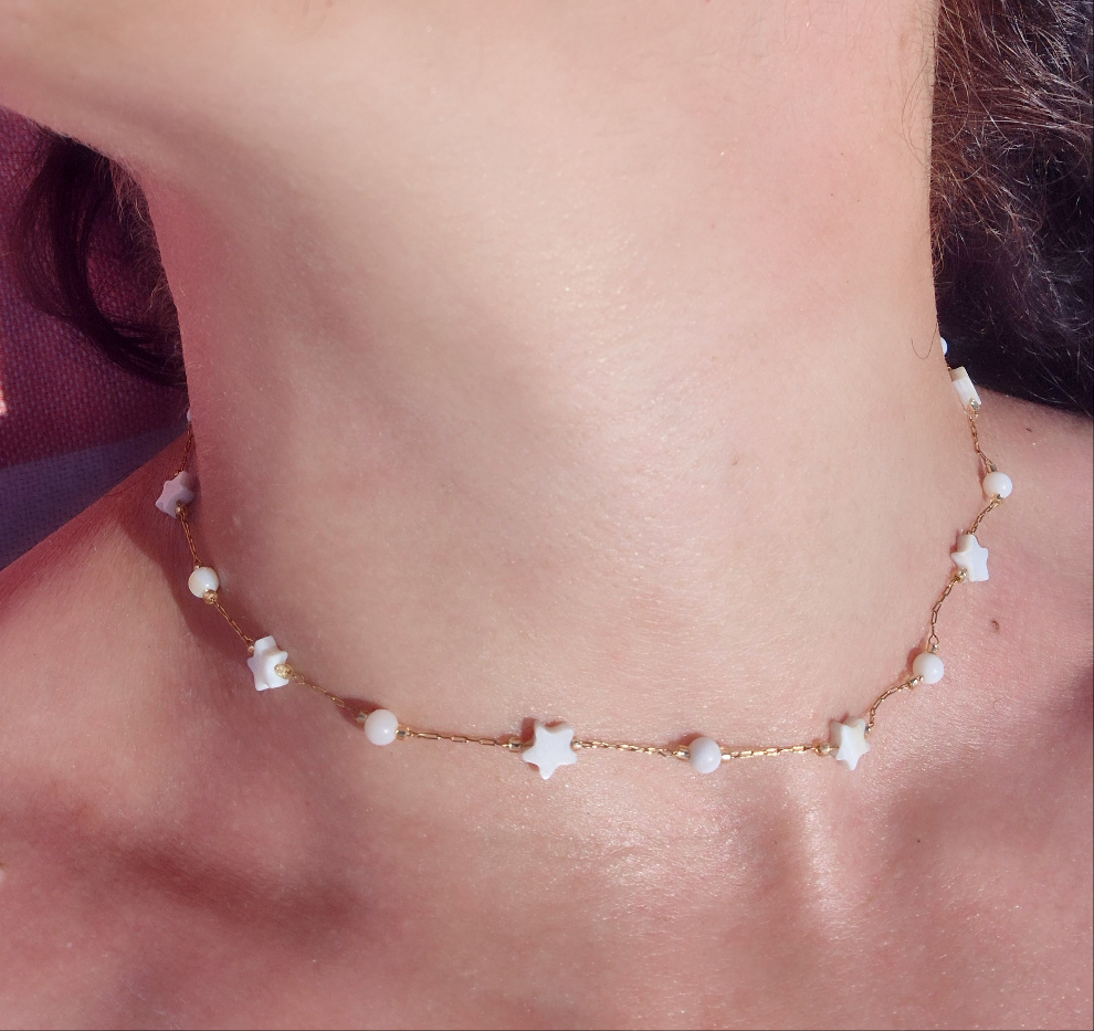 Collana Notte Magica d'Estate in acciaio Silver/Gold con Luna/Stelle in conchiglia tipo madreperla mis.40cm+estens.regolab.