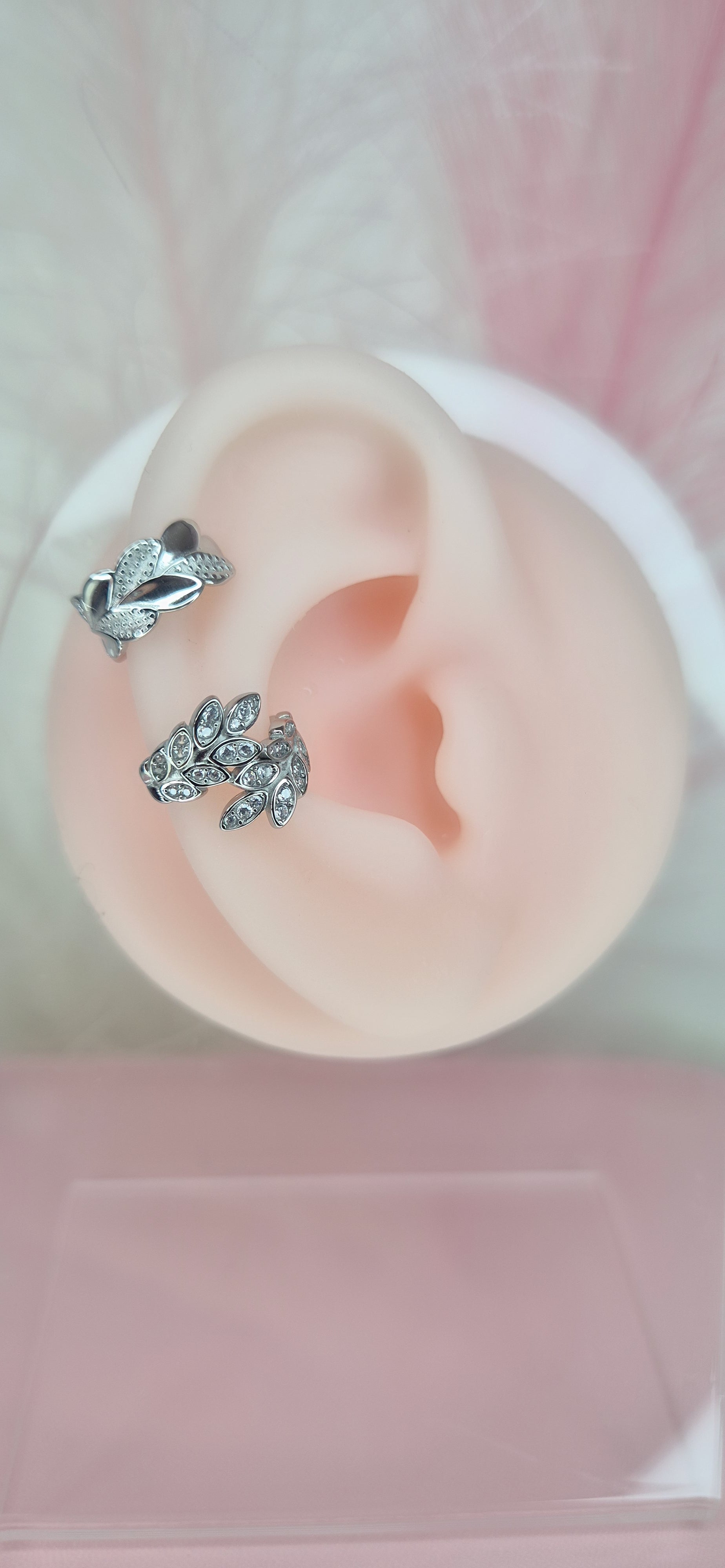 Earcuff Foglioline con zirconi 100% acciaio Silver anallergico (orecchino senza foro)