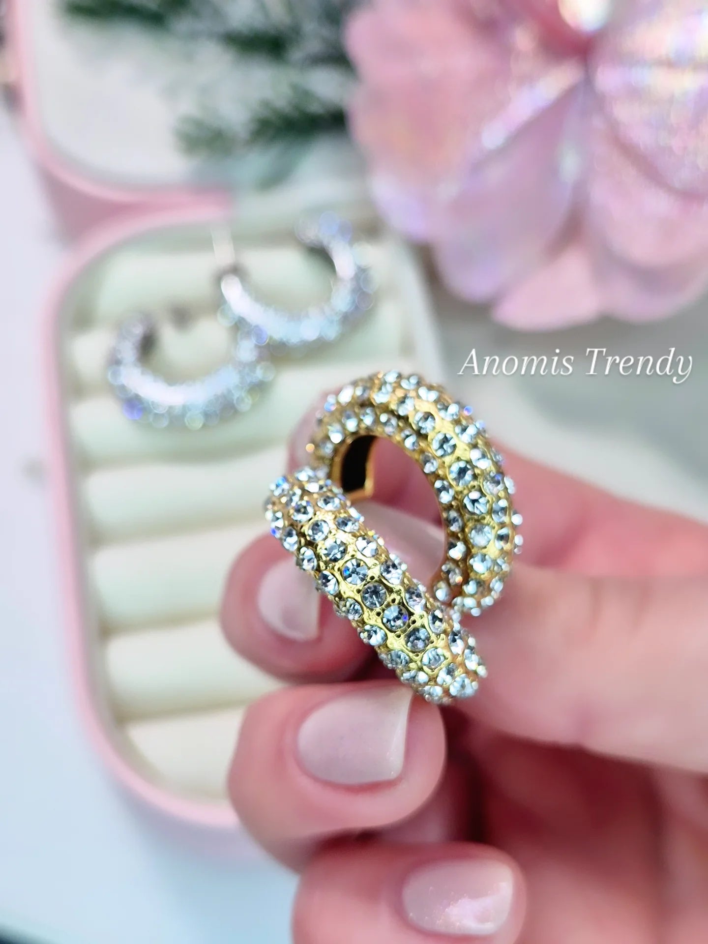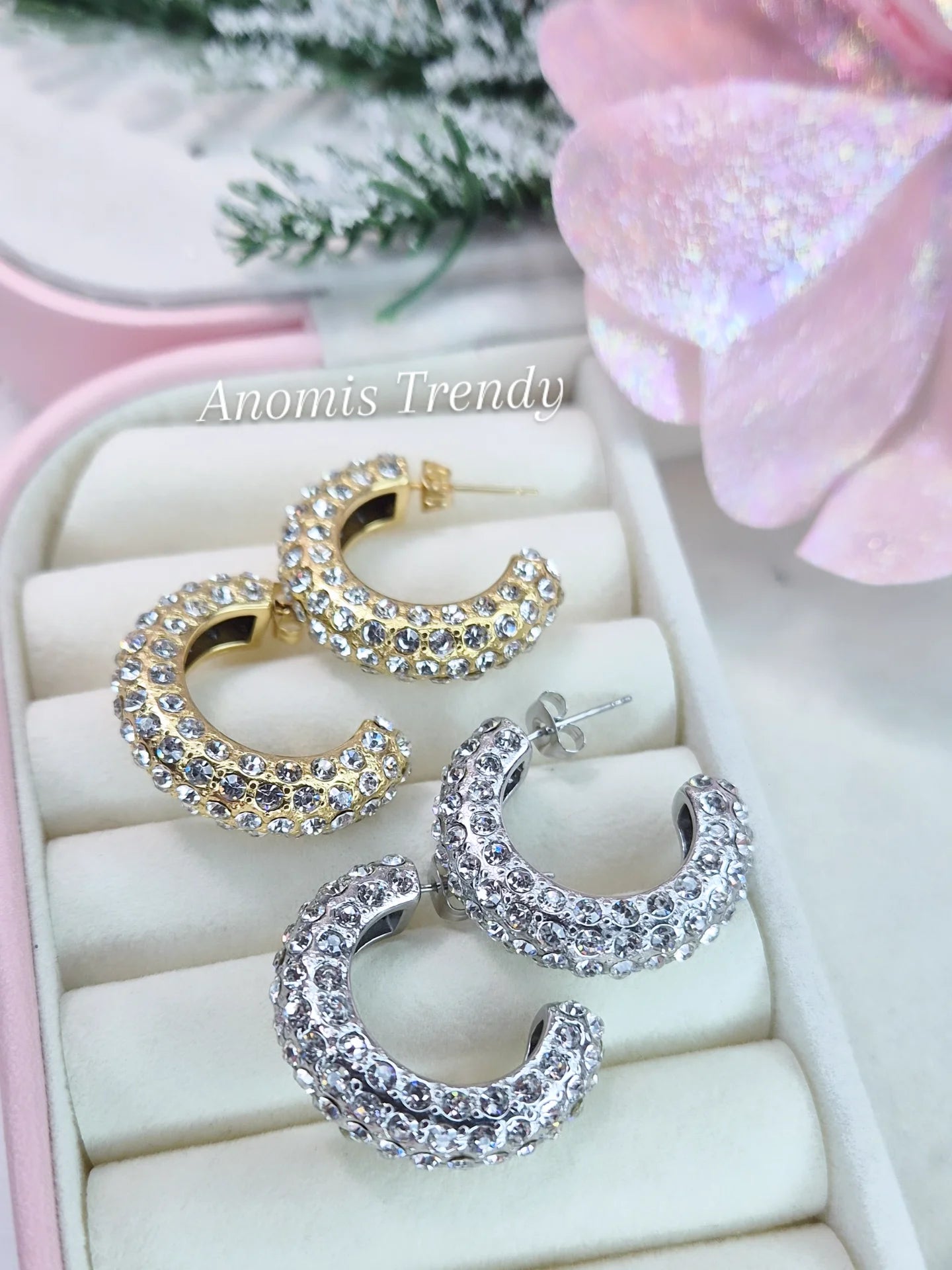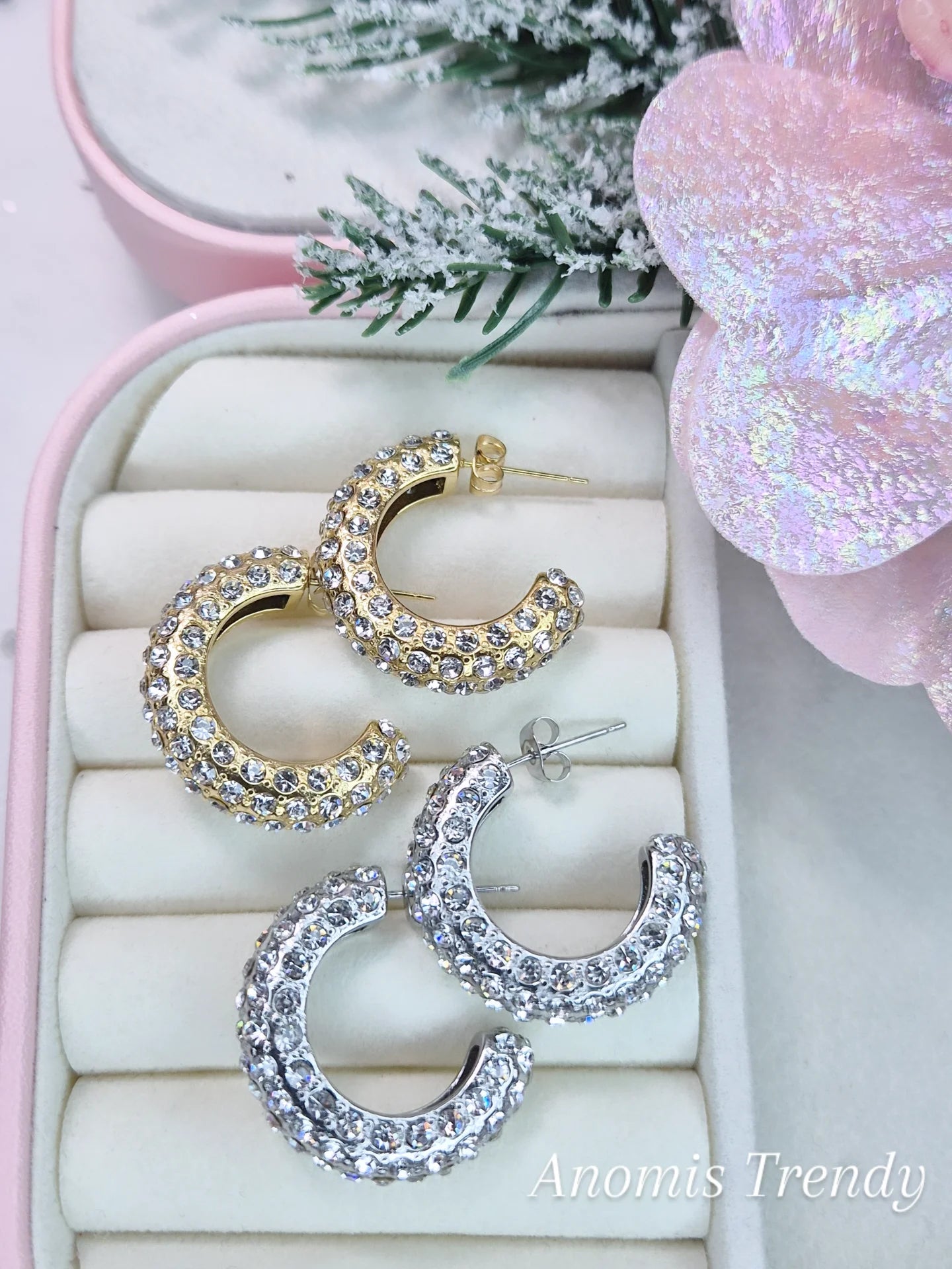 Orecchini semicerchi a C bold in pavè di zirconi 100% acciaio silver/gold anallergico