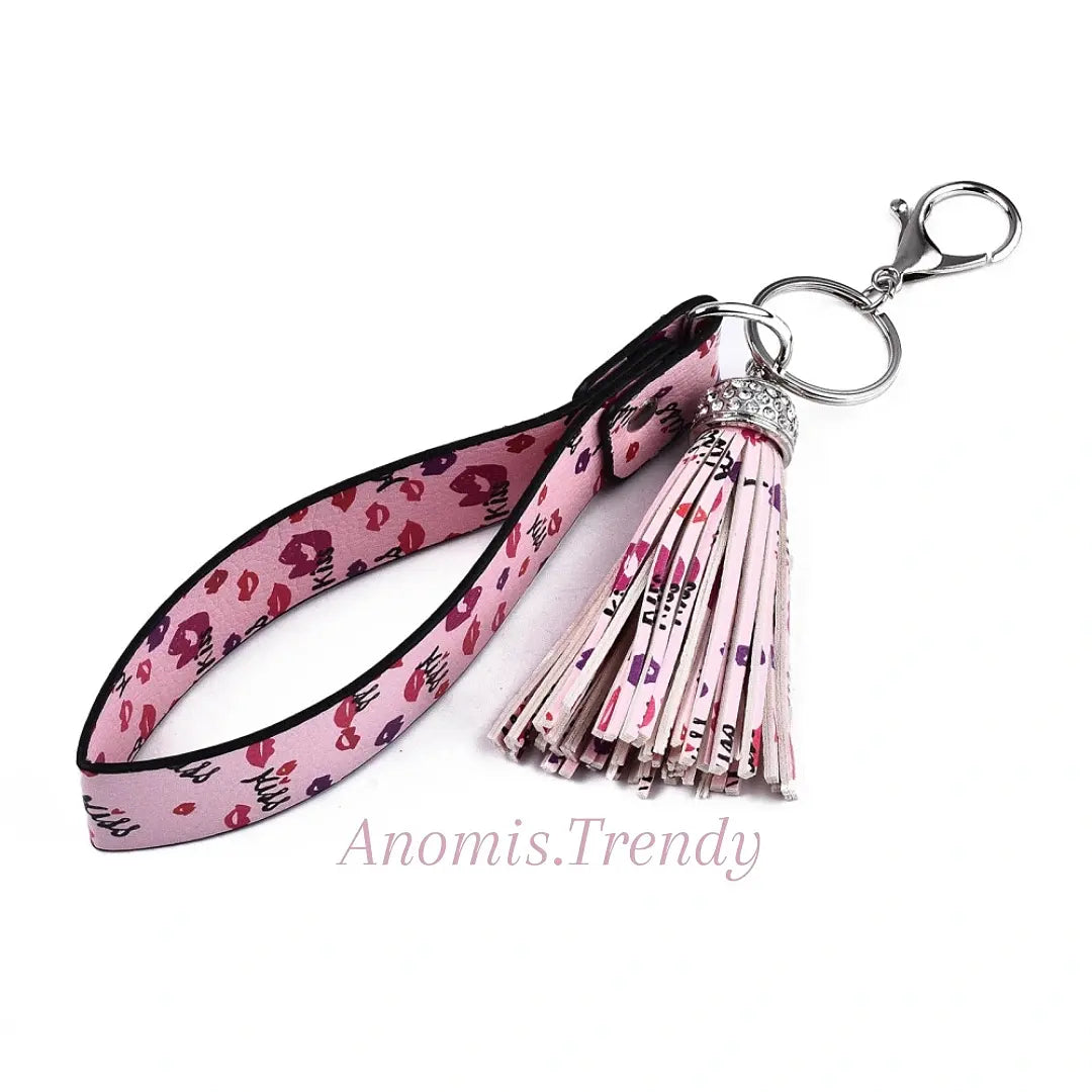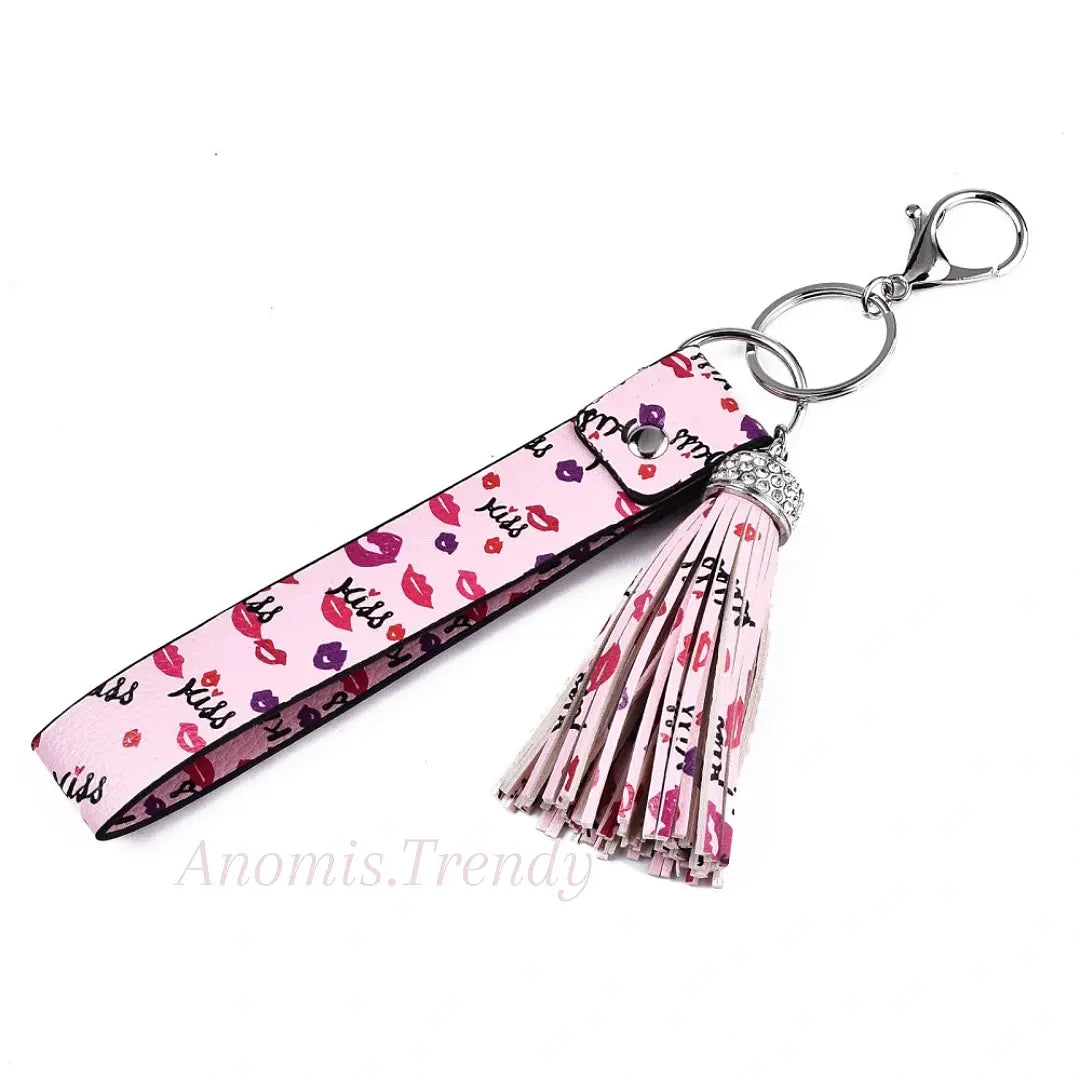 Portachiavi in similpelle rosa con labbra rossetto bacio e nappina con zirconi